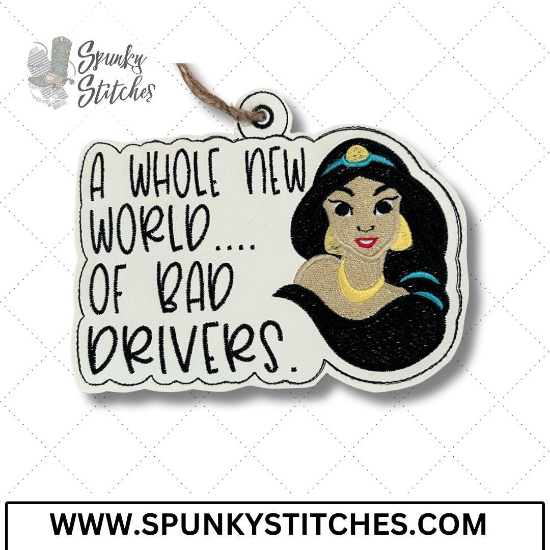 Bring some royal sass to your ride with this Jasmine-inspired car tag! Featuring the snarky phrase “A Whole New World… of Bad Drivers”, this in-the-hoop design is perfect for anyone navigating traffic with the patience of a princess (or lack thereof). With bold lettering and rich design details, it’s a hilarious and stylish way to express your royal road rage.
