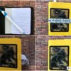 File comes in a 5×7 file. Cover fits a mini compostion notebook3.25in by 4.5in. Cover has a zipper pocket, pen slot, and band to go around notebook.