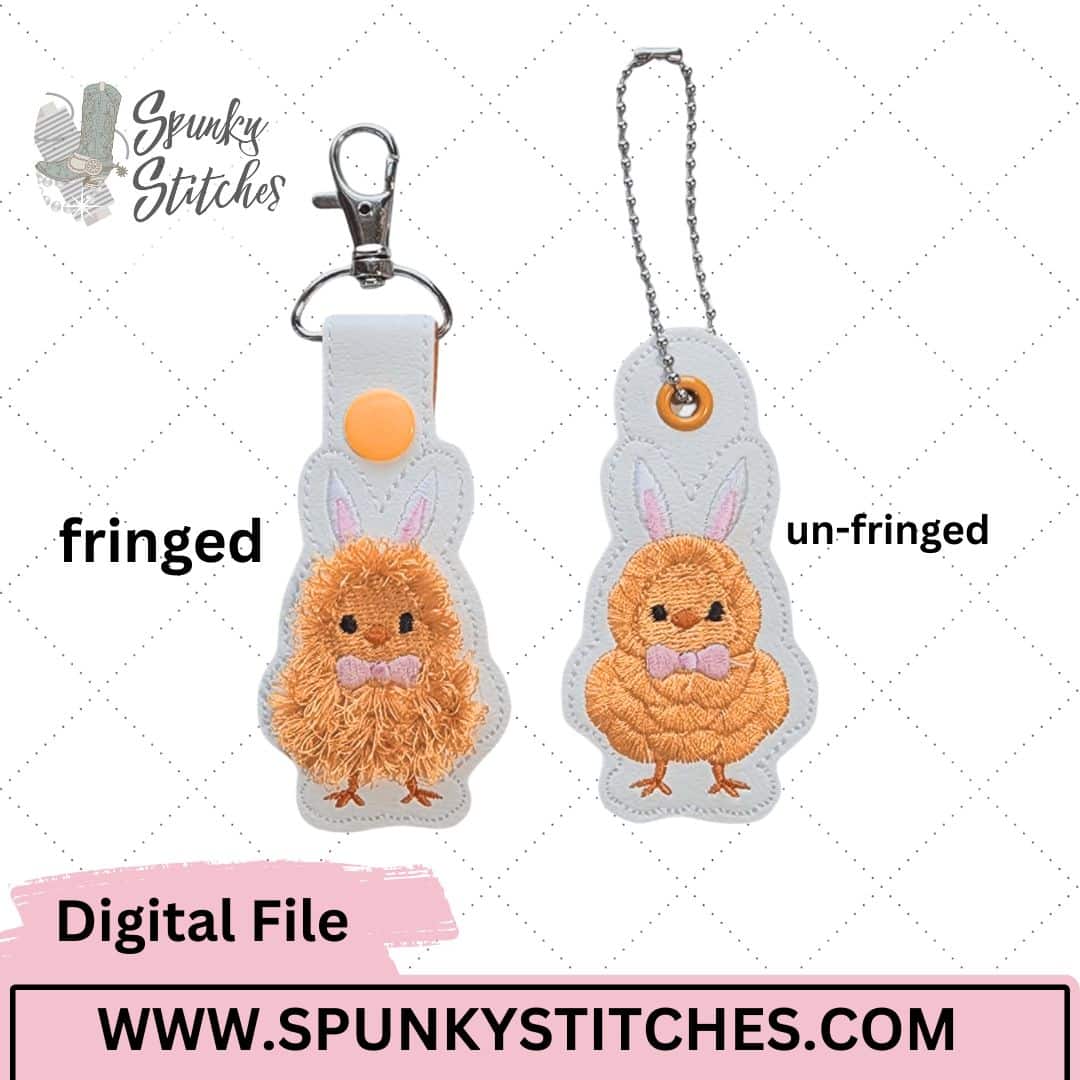 This adorable Fringe Bunny Chicken Key Fob features a cute chicken wearing bunny ears, stitched with a fun fringe embroidery technique that gives the feathers a fluffy, textured look. It’s a quick and satisfying in-the-hoop machine embroidery project that makes a perfect small gift or craft fair item.